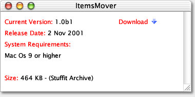 ItemsMover appears like a small palette on desktop. ![]() How it works: Launch ItemsMover. A small window will appear in your monitor. Then simply open your disk and cut or copy files and folders. Choose a destination and press Paste. That's all. To change the position of the ItemsMover window, press Command-M or choose the command Move Window from the File menu. |